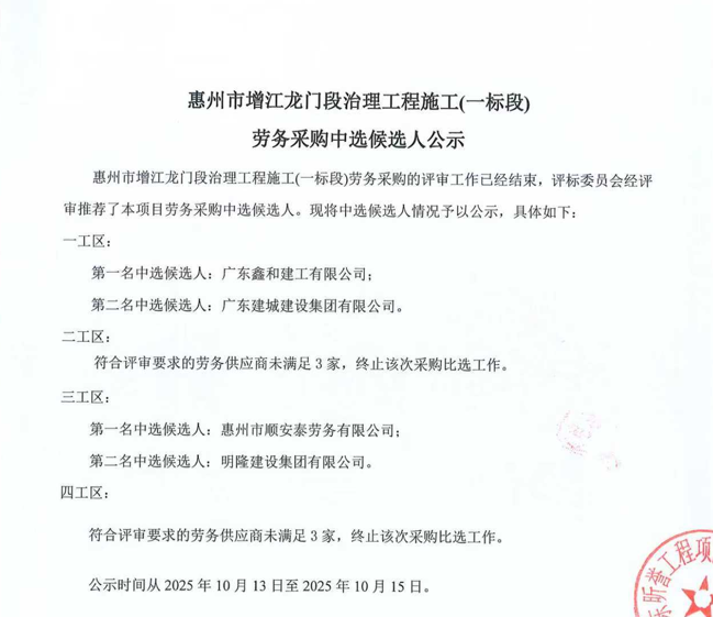 惠州市水电建筑工程有限公司劳务供应商库扩库评审结果公示……