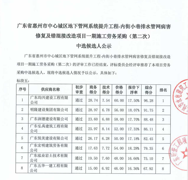 广东省惠州市中心城区地下管网系统提升工程-内街小巷排水管网病害修复及错混接改造项目一期施工劳务采购(第二次)中选候选人公示……