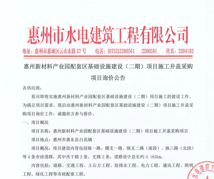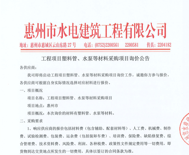 工程项目塑料管、水泵等材料采购项目询价公告……