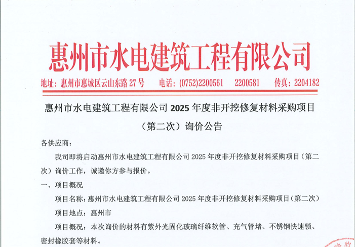 惠州市水电建筑工程有限公司2025年度非开挖修复材料采购项目(第二次)询价公告……