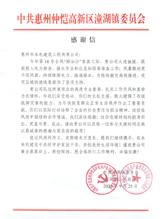 9月26日,仲恺高新区潼湖镇政府向水电公司发来感谢信,来信指出,水电公司在第18号台风“桦加沙”来袭之际,火速驰援,提前投入电力排查、排水作业和应急加固等准备工作;风暴期间更不惧风雨,持续保障电力、疏通排水,为抢险救灾高效推进、受灾区域快速恢复提供了坚实支持,体现了高度专业素养、扎实工作作风和真挚为民情怀。