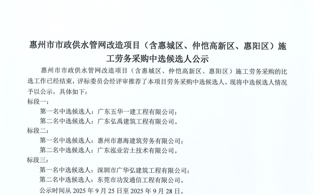 惠州市市政供水管网改造项目(含惠城区、仲恺高新区、惠阳区)施工劳务采购中选候选人公示......