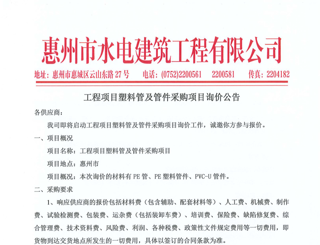 工程项目塑料管、水泵等材料采购项目询价公告......