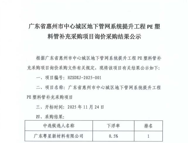广东省惠州市中心城区地下管网系统提升工程PE塑料管补充采购项目询价采购结果公示......