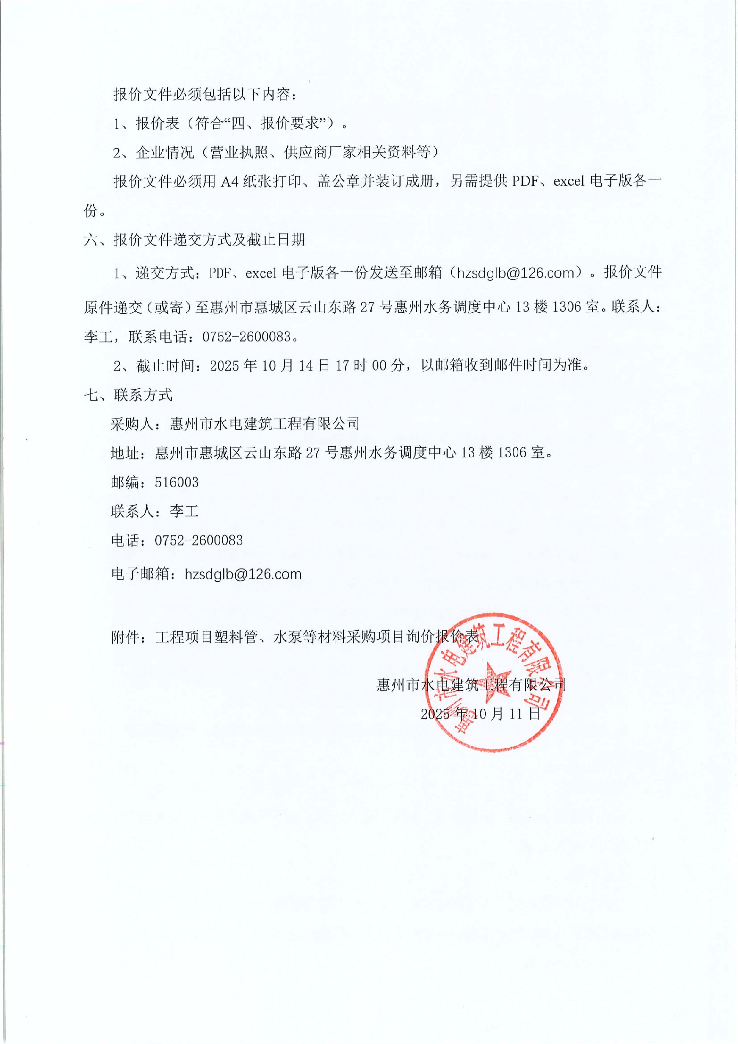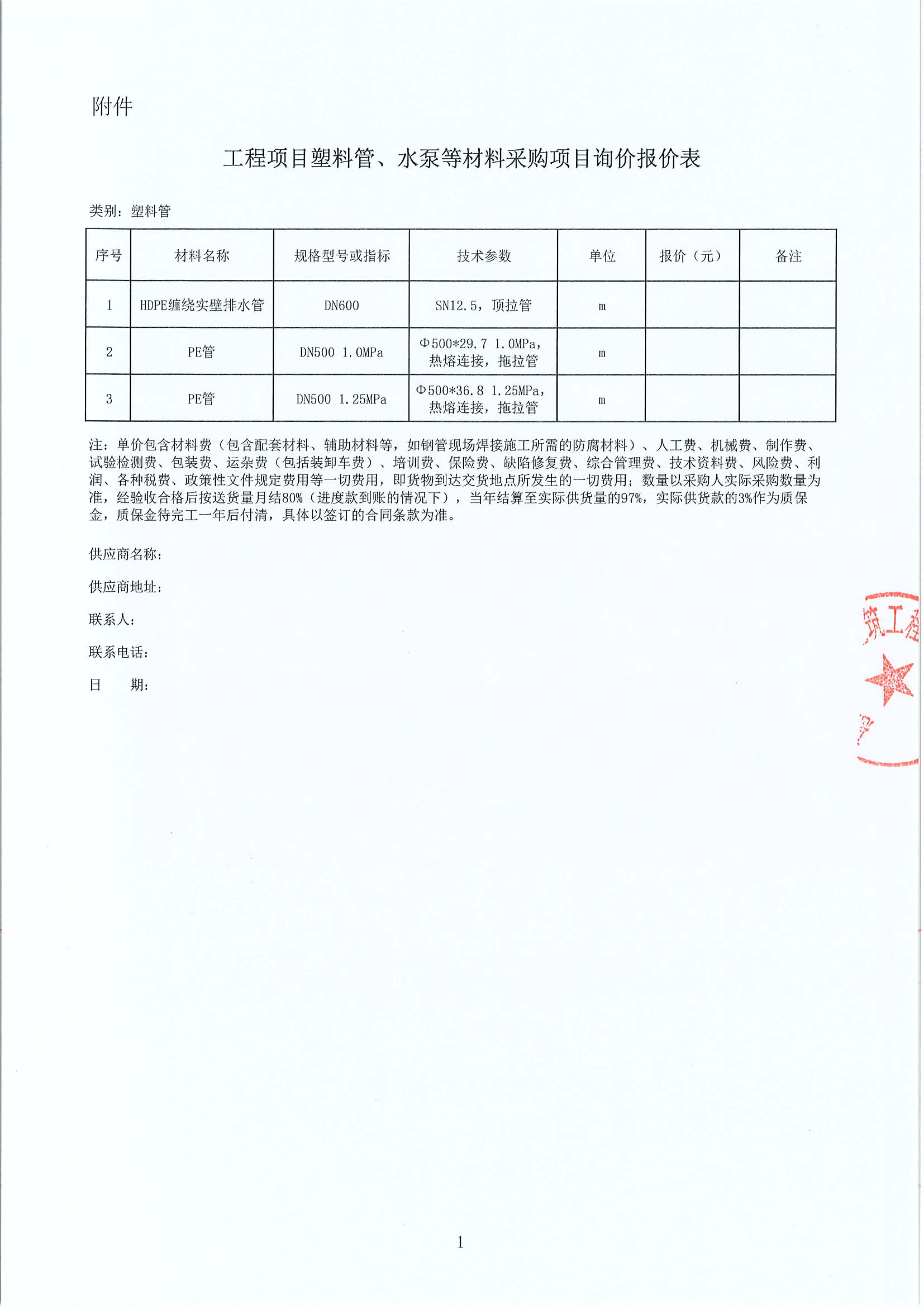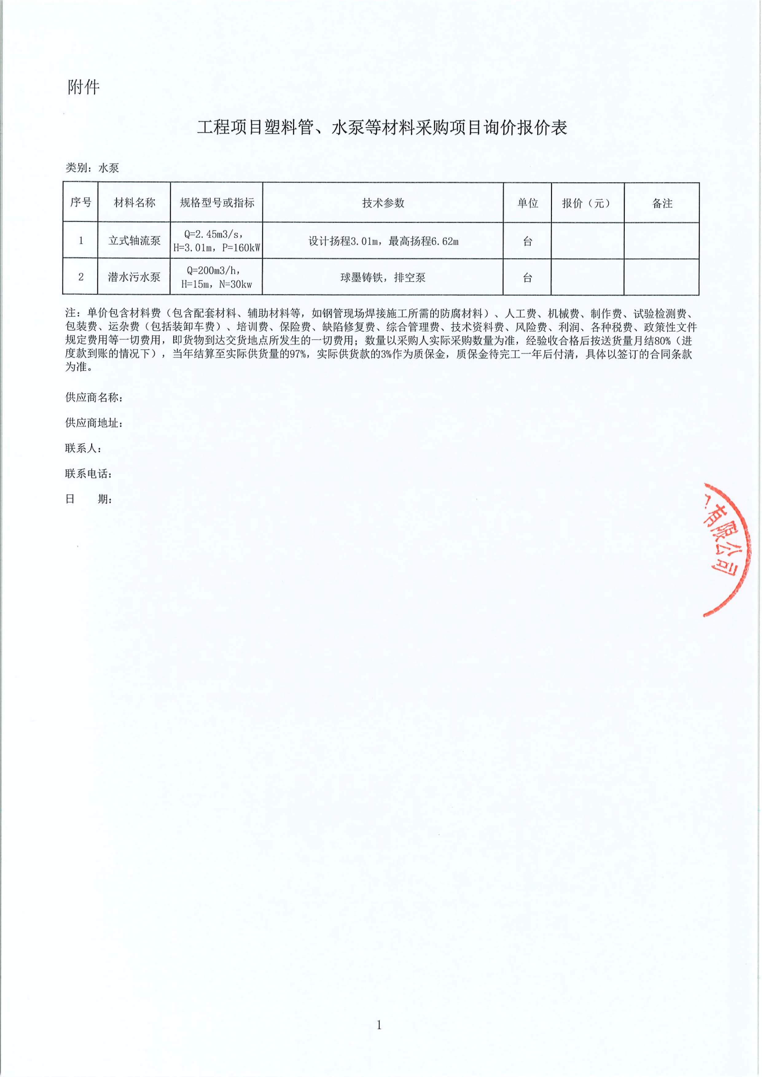 工程项目塑料管、水泵等材料采购项目询价公告附件: