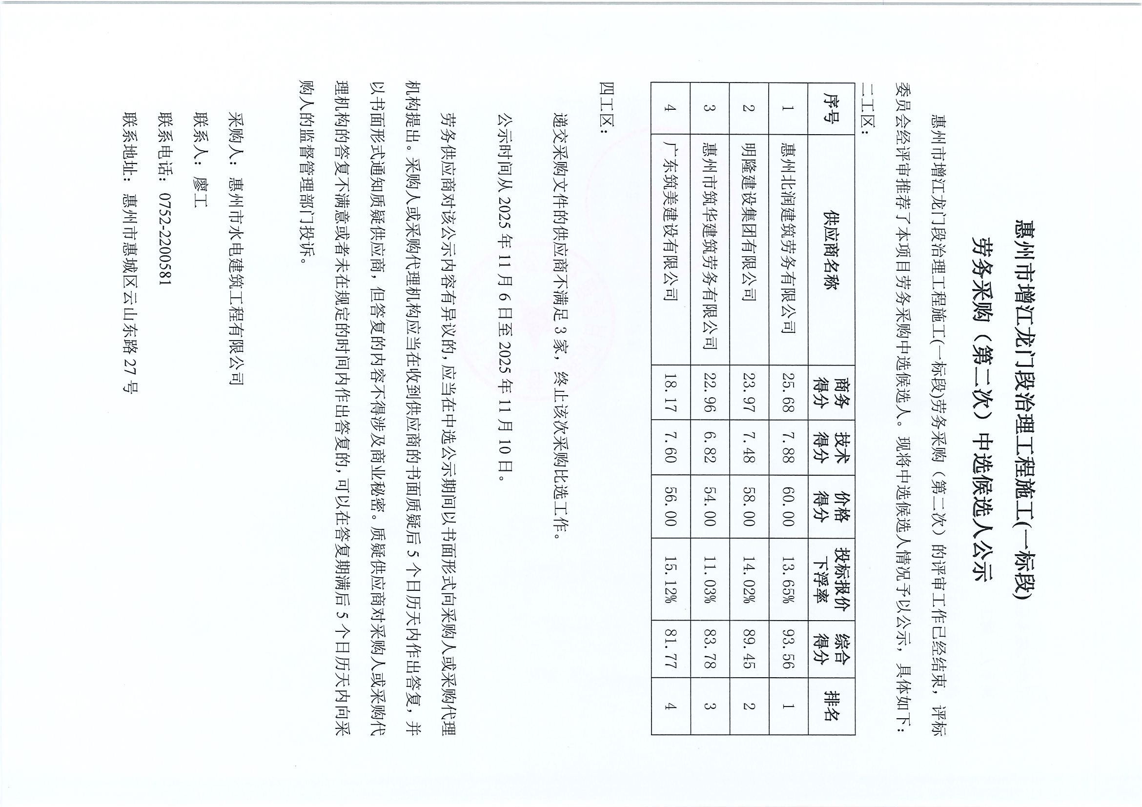 惠州市增江龙门段治理工程施工(一标段) 劳务采购(第二次)中选候选人公示