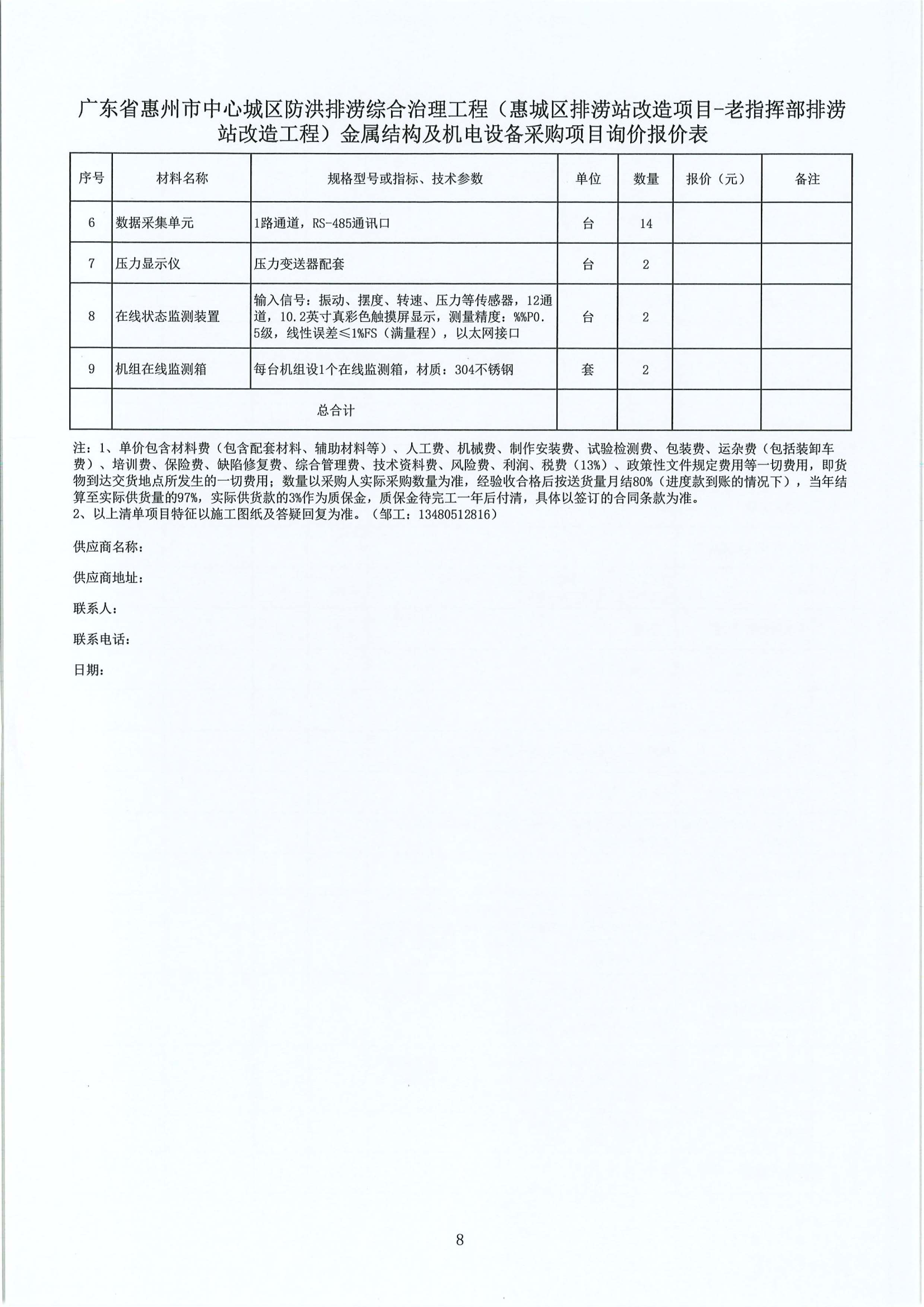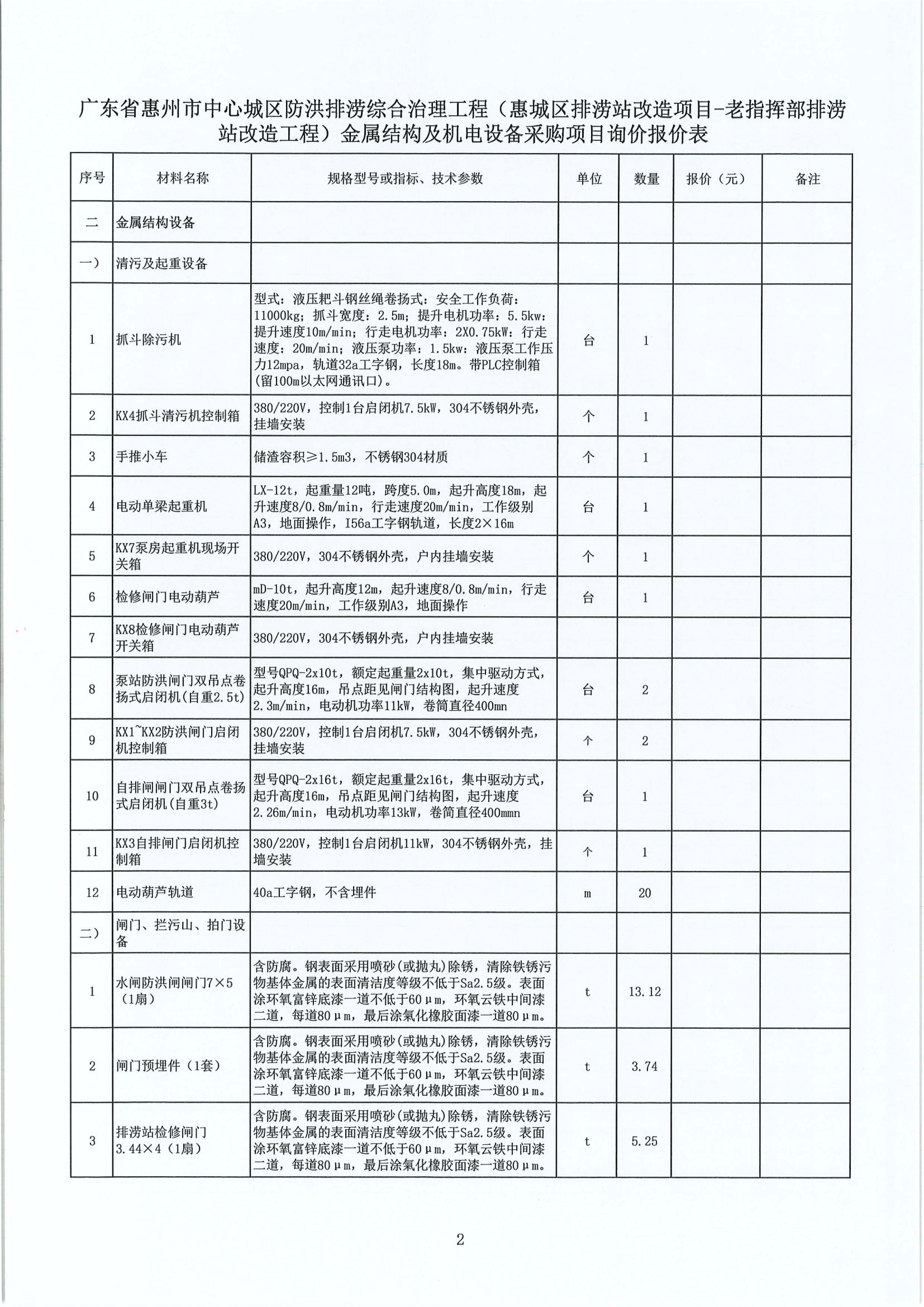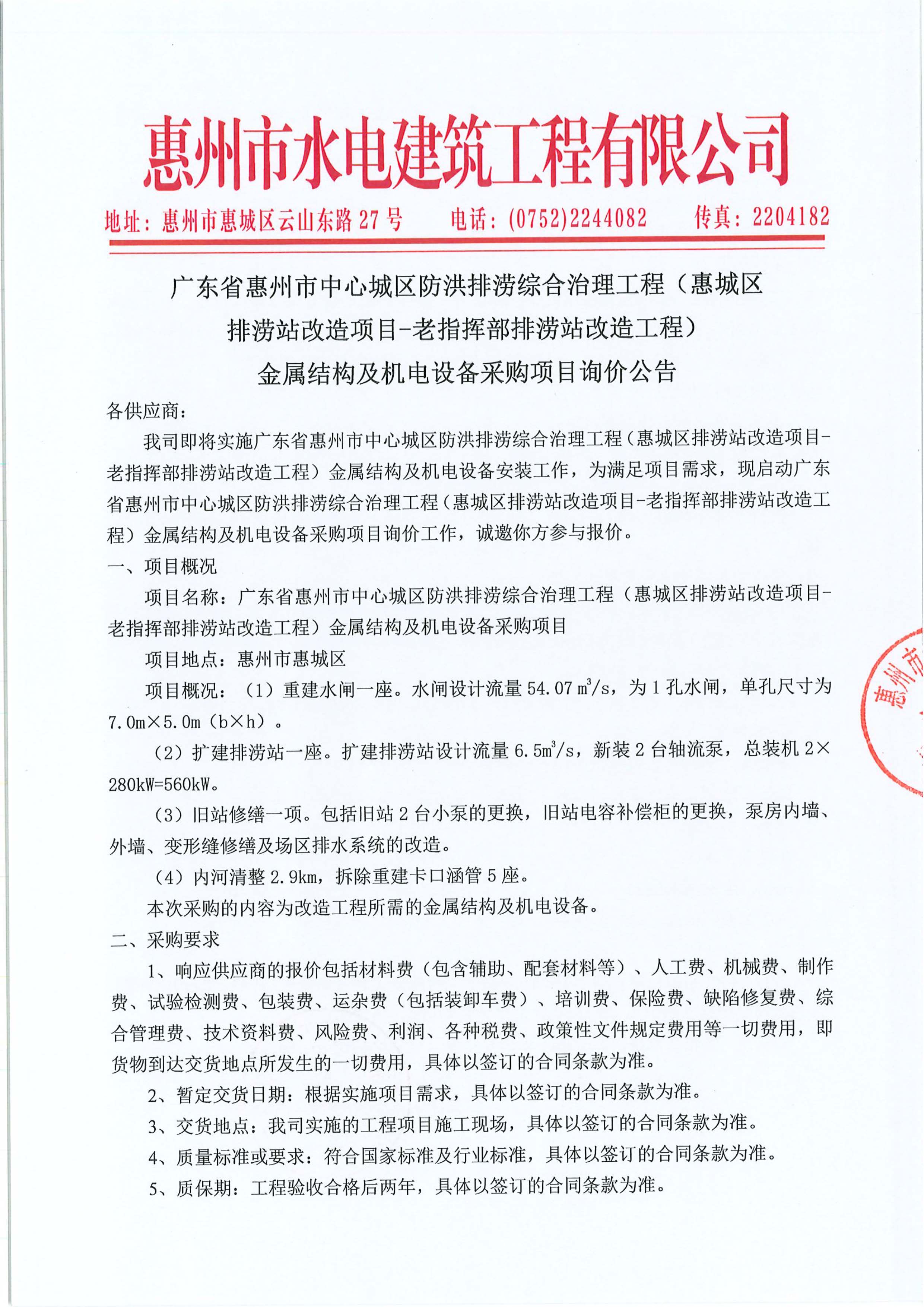 广东省惠州市中心城区防洪排涝综合治理工程(惠城区排涝站改造项目-老指挥部排涝站改造工程)金属结构及机电设备采购项目询价公告附件: