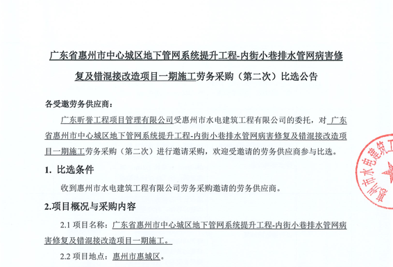 广东省惠州市中心城区地下管网系统提升工程-内街小巷排水管网病害修复及错混接改造项目一期施工劳务采购(第二次)比选公告......