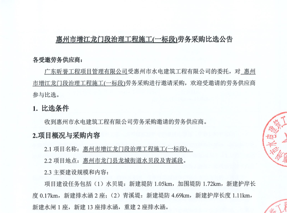 惠州市增江龙门段治理工程施工(一标段)劳务采购比选公告......