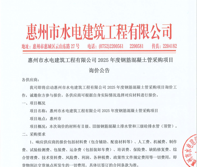 惠州市水电建筑工程有限公司2025年度钢筋混凝土管采购项目询价公告......