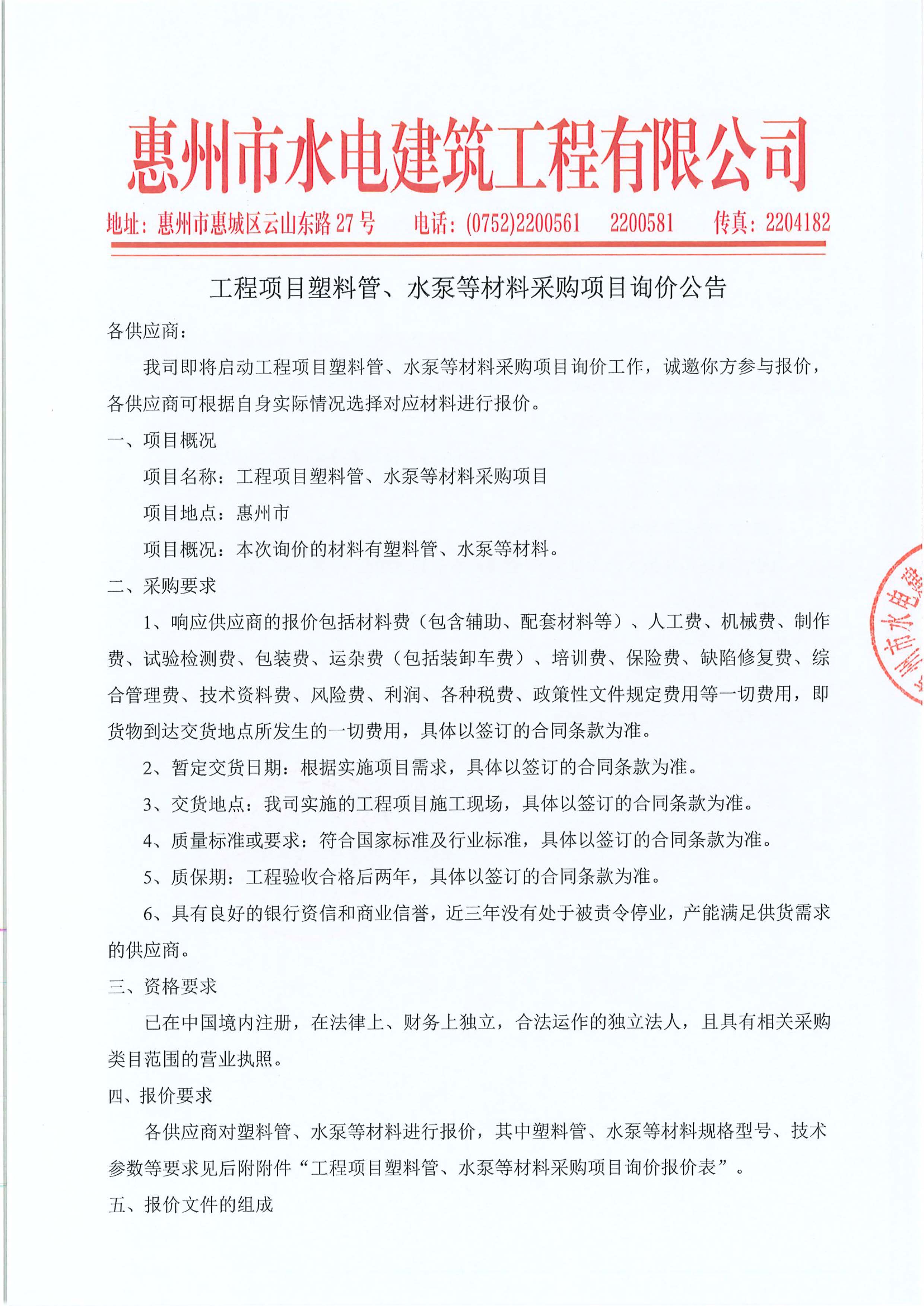 工程项目塑料管、水泵等材料采购项目询价公告附件: