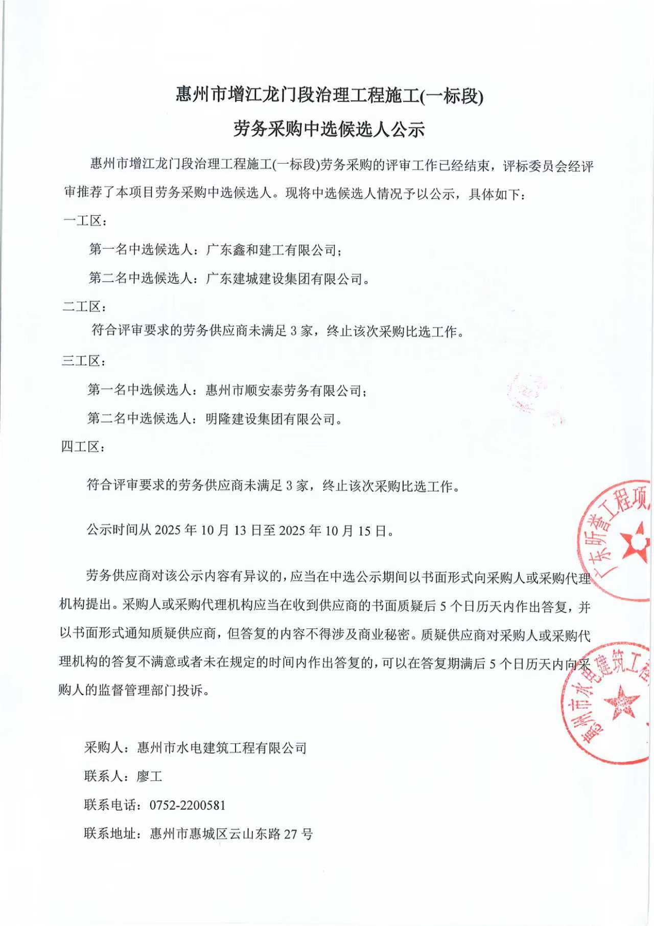 惠州市增江龙门段治理工程施工(一标段)劳务采购中选候选人公示
